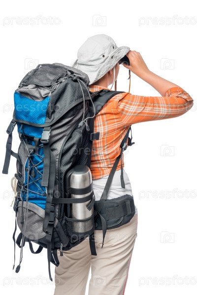 Женщина с большим рюкзаком смотрит в бинокль