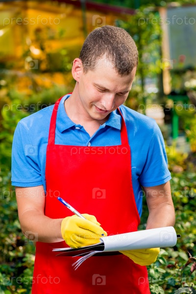 Садовник в фартуке регистрирует темпы роста растений в теплице