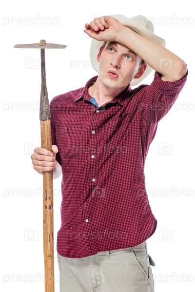 Усталый фермер с мотыгой в шляпе на белом фоне