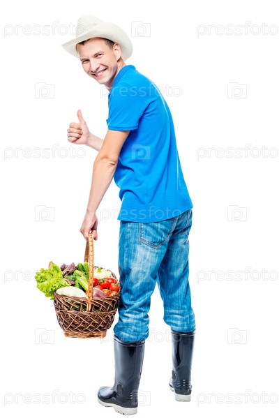 Фермер с корзиной овощей на белом фоне
