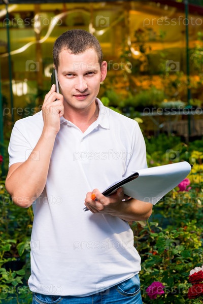Портрет бизнесмена с телефоном в оранжерее