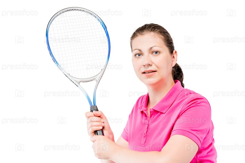 Портрет сконцентрированного теннисиста с ракеткой на белом фоне