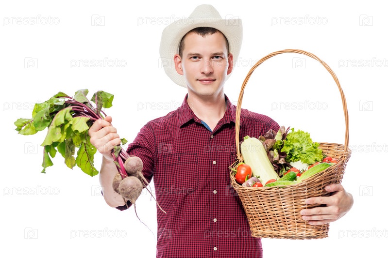 Молодой человек с корзиной овощей из сада