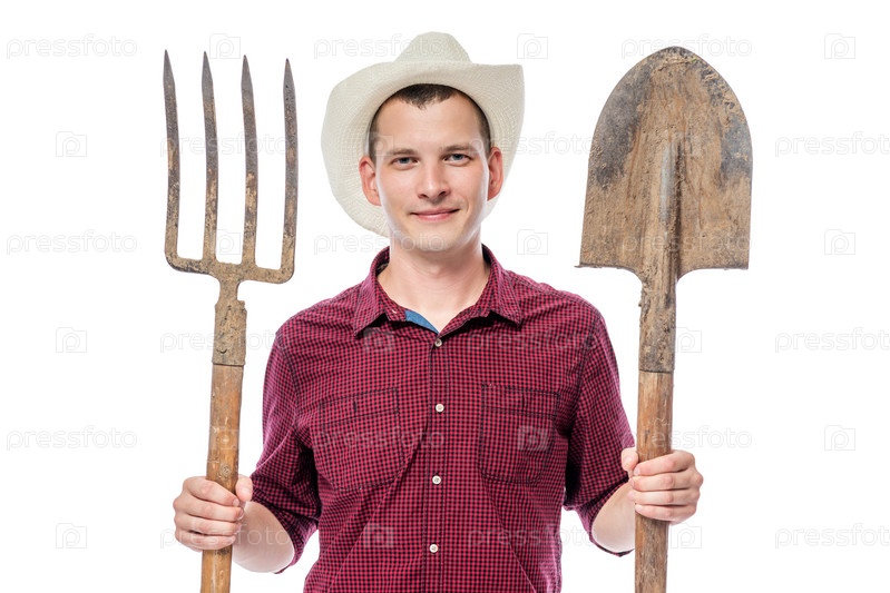 Фермер в шляпе с вилами и лопатой на белом фоне