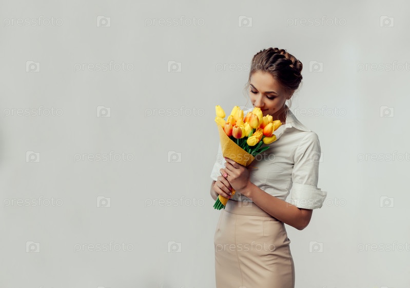 Красивая элегантная молодая женщина с тюльпанами