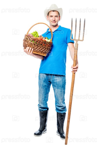 Фермер с вилами и корзина с овощами