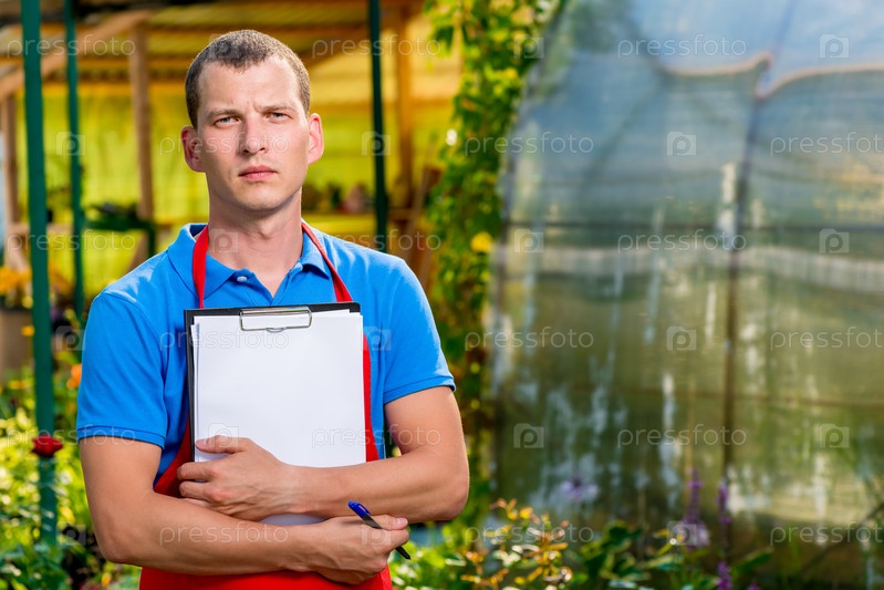 Садовник на фоне растений в теплице