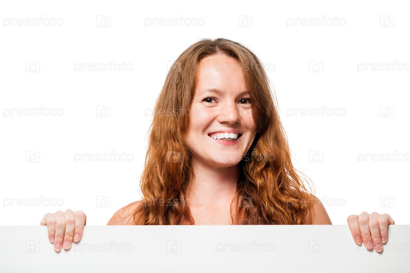 Улыбающаяся девушка с веснушками за плакатом