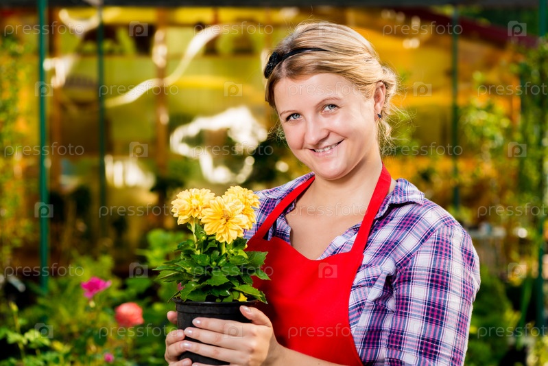 Портрет флориста в фартуке с желтыми цветами в горшке