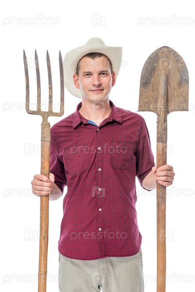 Портрет фермера в шляпе с вилами и лопатой