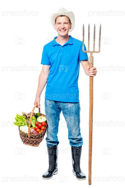 Счастливый фермер с вилкой и урожаем овощей на белом фоне