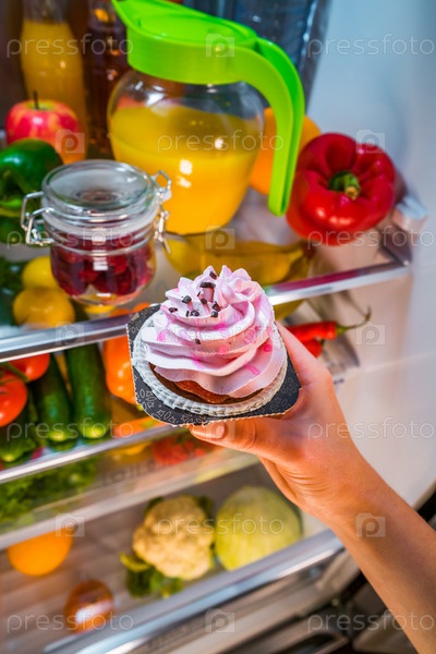 Женщина берет сладкий торт из открытого холодильника