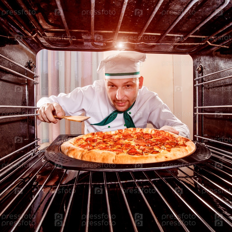 Шеф-повар готовит пиццу в духовке