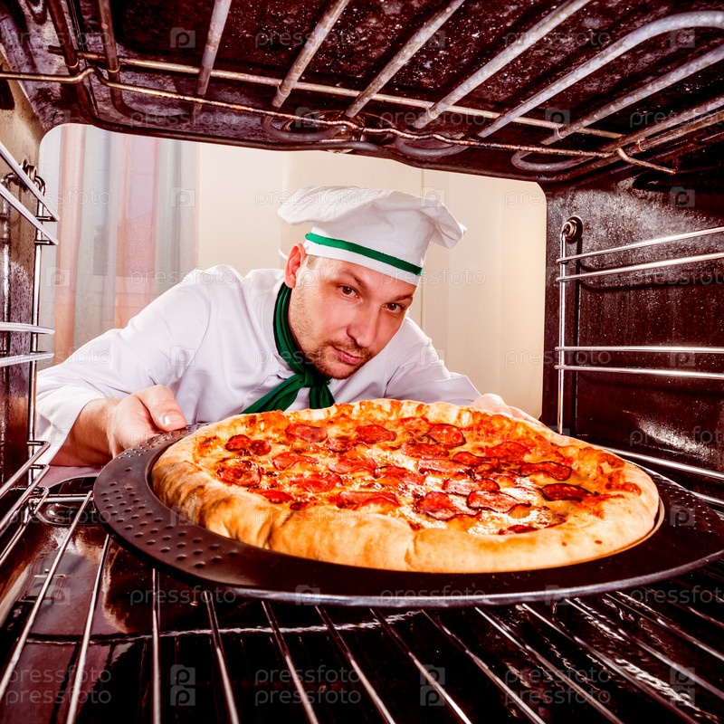 Шеф-повар готовит пиццу в духовке