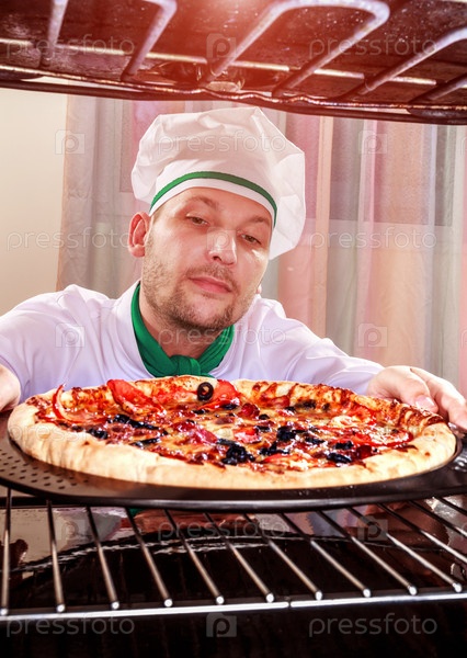 Шеф-повар готовит пиццу в духовке