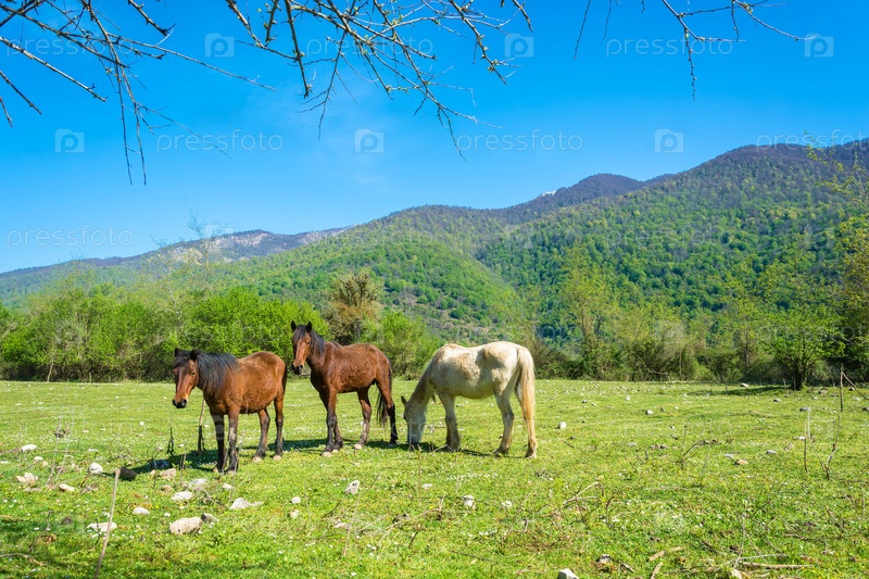 Красивый горный пейзаж с лошадьми