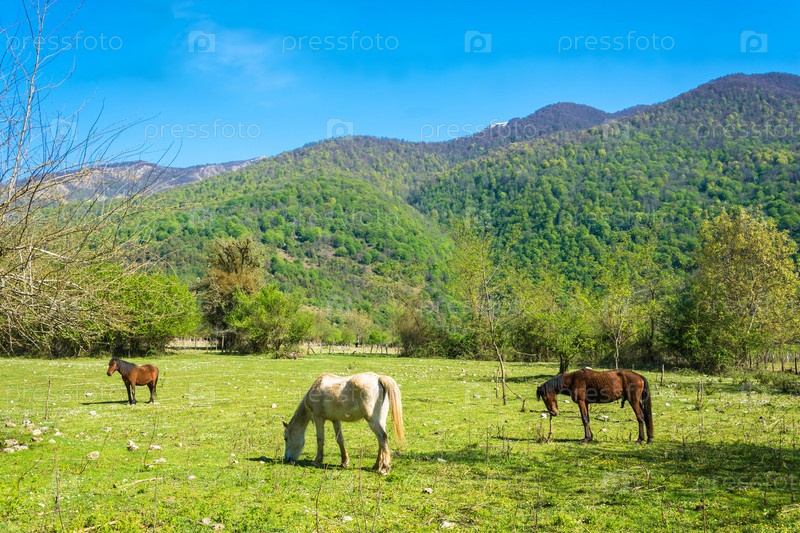 Красивый горный пейзаж с лошадьми