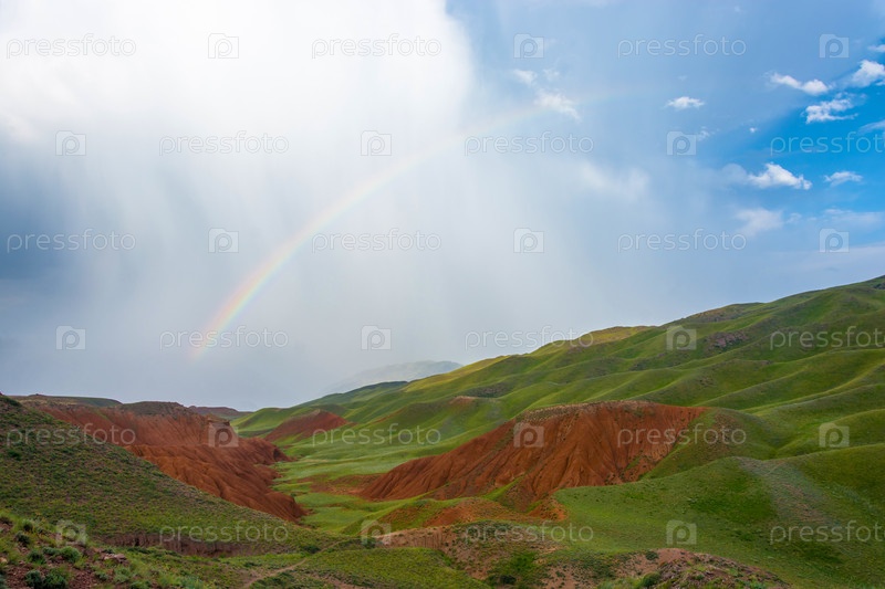 Красивый горный пейзаж с яркой радугой, Кыргызстан