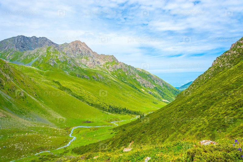 Горная река, текущая среди зеленых горных склонов, Кыргызстан
