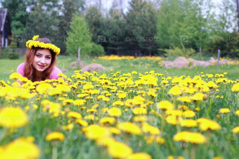 Молодая женщина на лугу с одуванчиками