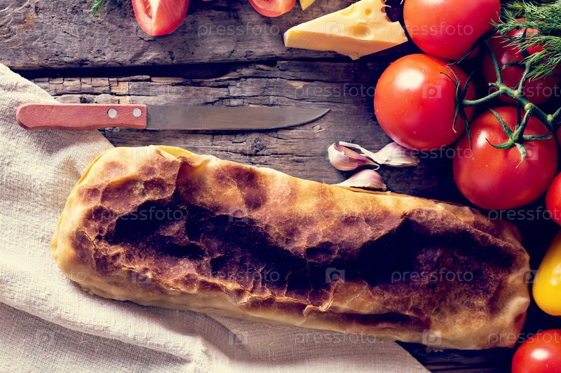 Домашний штрудель с курицей, сыром, овощами и белым соусом