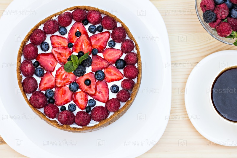Чизкейк со свежими ягодами и черный кофе