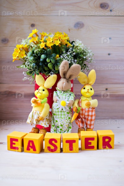 Пасхальная композиция с кроликами, яйцами, цветами и нарезанными кубиками