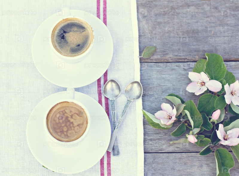 Кофе и весенние цветы на фоне старых деревянных досок