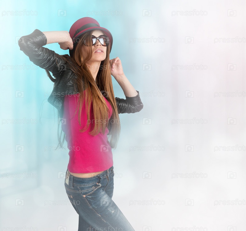 Стильная девушка в красной шляпе, солнцезащитных очках и черном кожаном жакете на светлом фоне