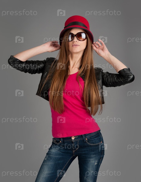 Стильная девушка в красной шляпе, солнцезащитных очках и черном кожаном жакете на сером фоне