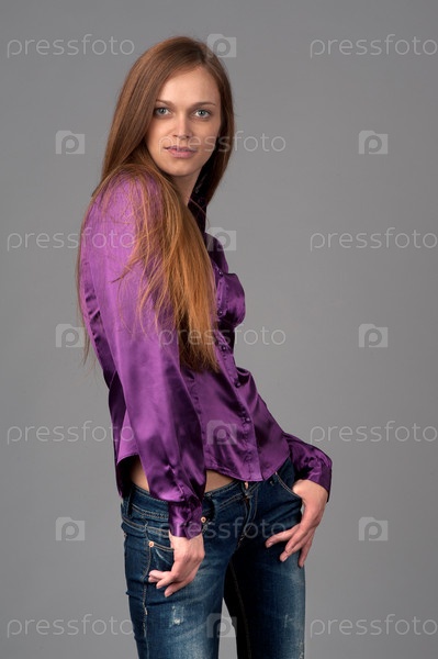 Красивая девушка в фиолетовой блузке на сером фоне