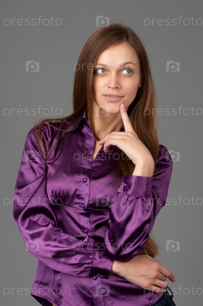 Красивая задумчивая девушка в фиолетовой блузке на сером фоне