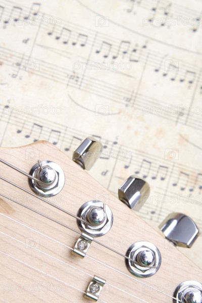 Часть гитары с колками на фоне нотной тетради