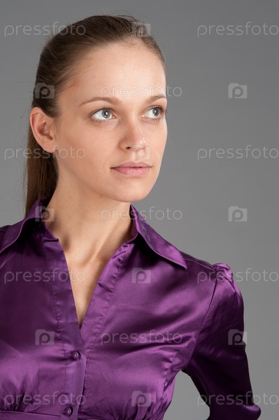 Красивая девушка в фиолетовой блузке на сером фоне