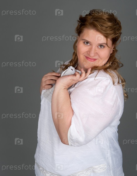 Полная женщина на сером фоне
