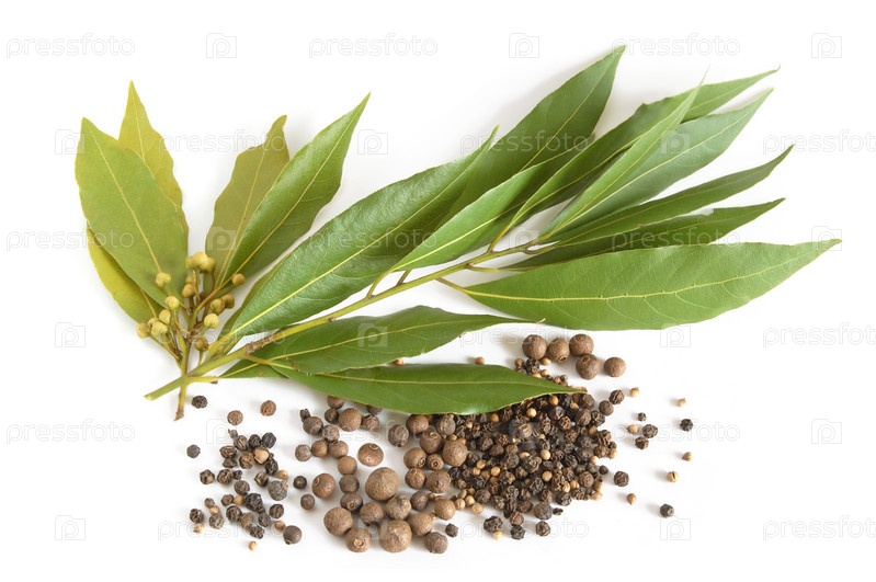Свежие лавровые листья, черный перец и кориандр на белом фоне