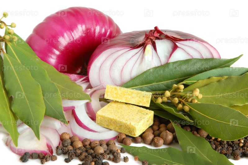 Свежие лавровые листья, лук, бульонные кубики, черный перец и кориандр