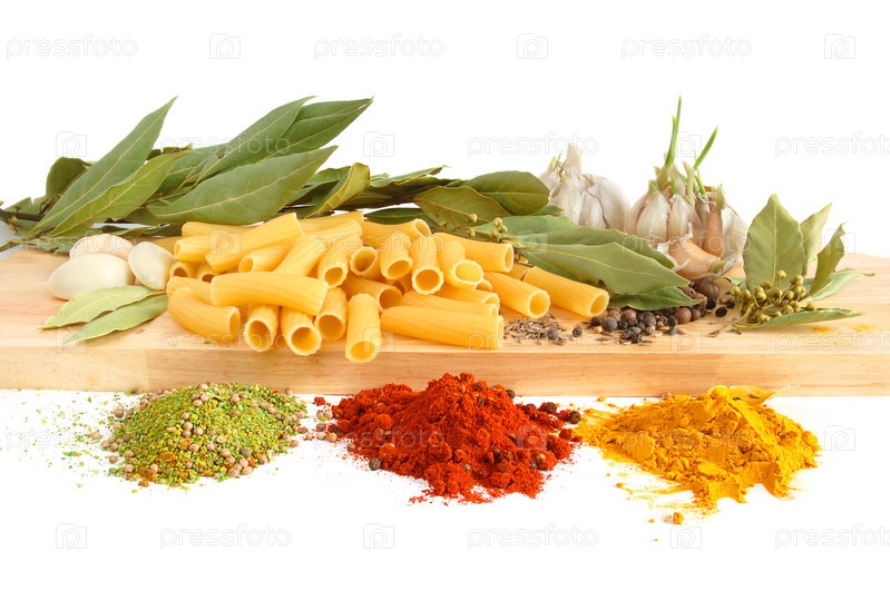 Макароны со свежими лавровыми листьями, чесноком, черным перцем и семенами тмина на деревянной разделочной доске