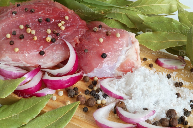 Сырая свинина с пряностями на деревянной доске
