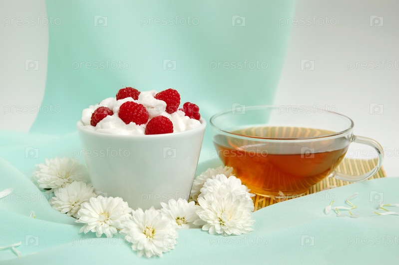 Малина со взбитыми сливками и чашка чая