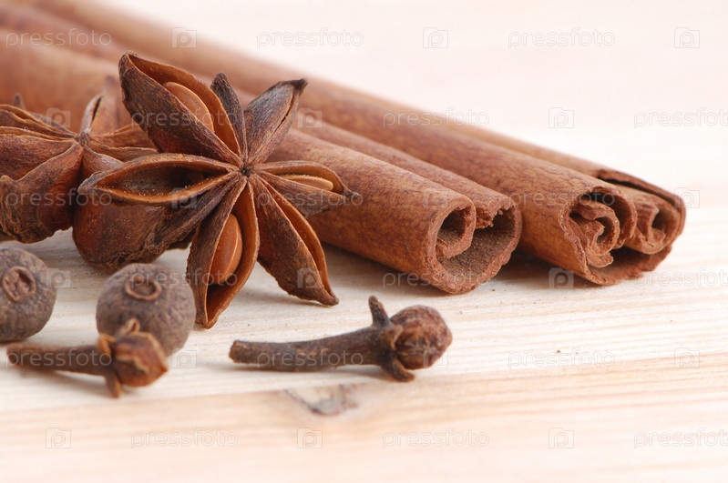 Палочки корицы и анис на деревянной доске
