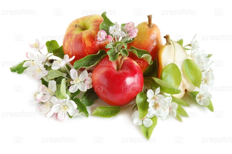 Груши и яблоки с зелеными листьями и цветами на белом фоне