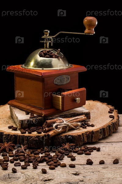 Натюрморт с кофейными зернами и старой кофемолкой