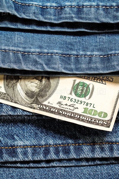 100 американских долларов на фоне джинсов