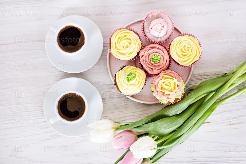 Вкусные кексы и чашечки кофе