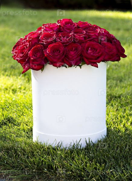 Букет из красных роз в коробке на траве