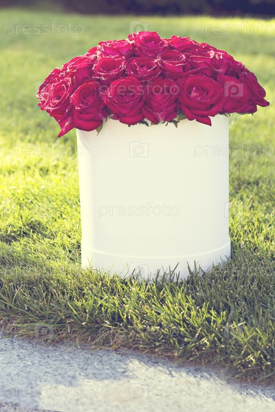 Букет из красных роз в коробке на траве