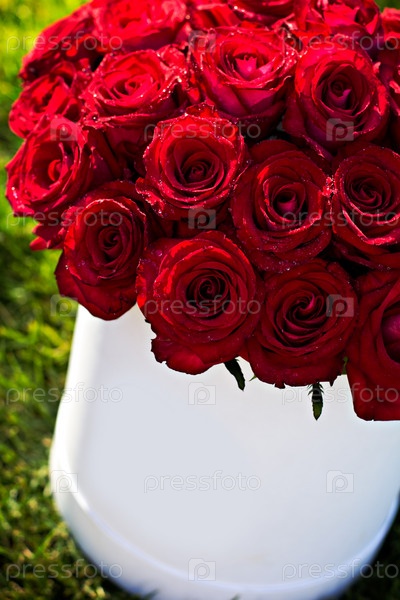 Букет из красных роз в коробке на траве