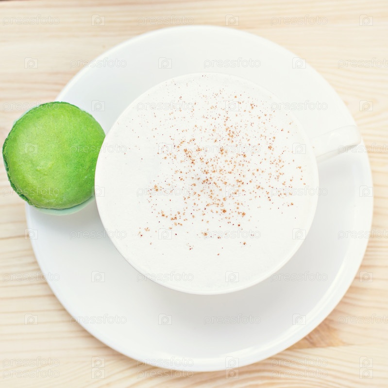 Зеленые французские макароны и кофе