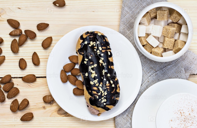 Шоколадный эклер с чашкой кофе